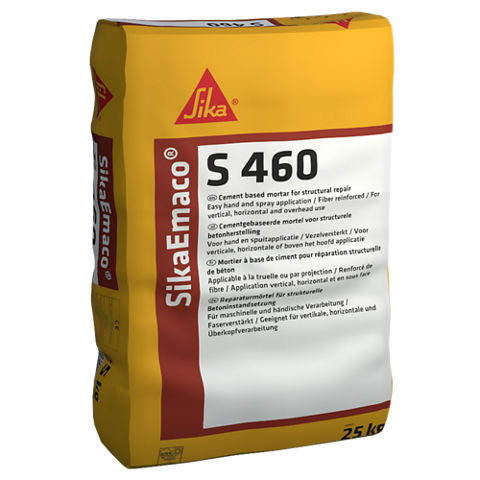 SikaEmaco S 460 is een 1-component, krimp gecompenseerde, constructieve reparatiemortel. SikaEmaco S 460 is een gebruiksklaar product met hydraulische bindmiddelen en zand met een goede korrelopbouw. SikaEmaco S 460 is gemodifieerd met speciaal geselecteerde polymeer vezels (PAN – polyacrylonitryl) en speciale additieven om het risico op krimpscheuren aanzienlijk te verminderen. Gemengd met water vormt SikaEmaco S 460 een thixotrope mortel die eenvoudig met spuitapplicatie of met een spaan worden aangebracht. Het wordt aanbevolen voor reparaties met een laagdikte van 5 tot 40 mm per laag. SikaEmaco S 460 voldoet aan de eisen volgens de Europese norm EN 1504 deel 3 Klasse R4.